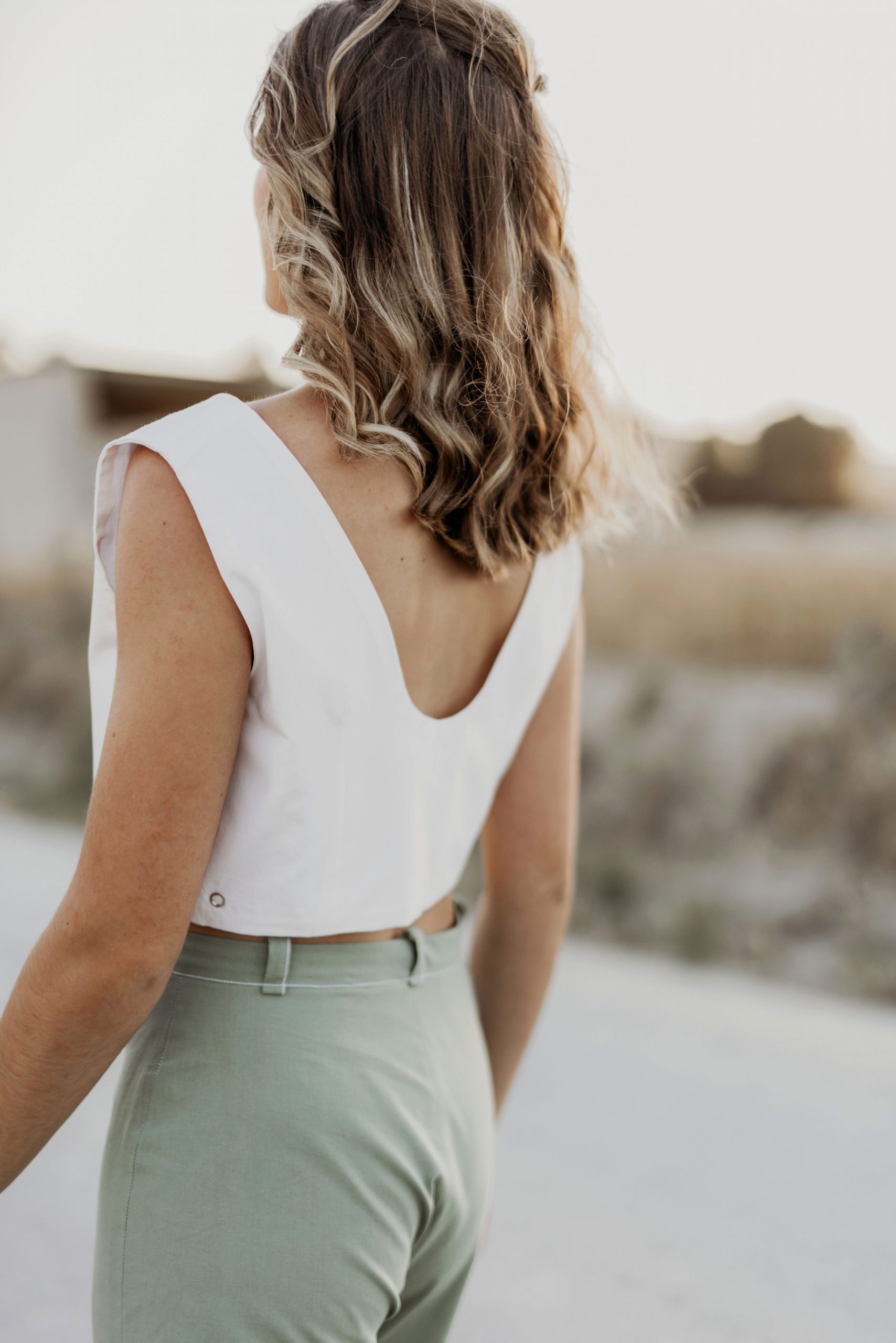 La opción más veraniega de la colección. Pieza multi posicional larga hasta la cintura. Se puede llevar cruzada con botones a presión o atada con un nudo. Escote en forma de pico y espalda escotada.