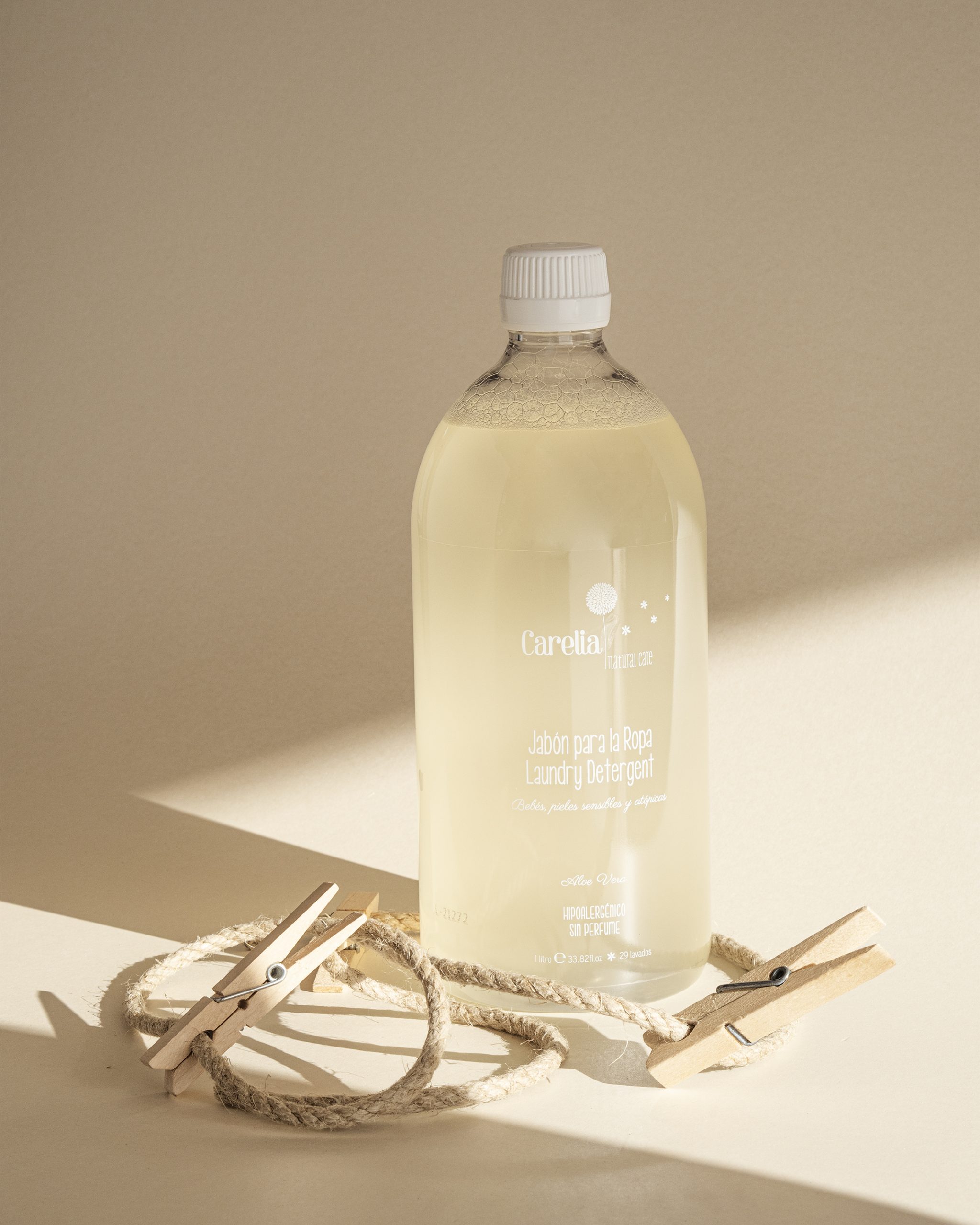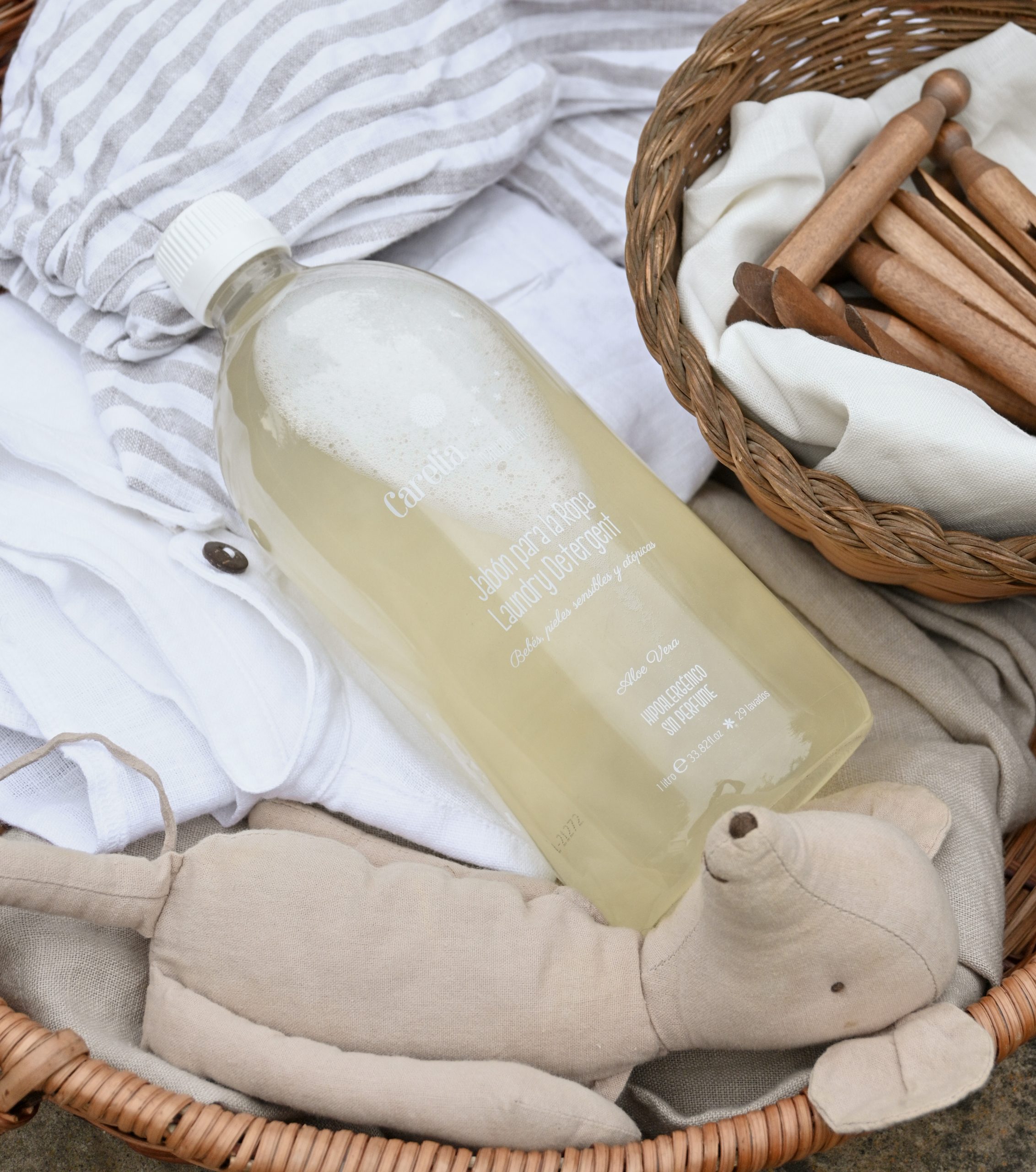 Jabón para la ropa 100% natural formulado a base de plantas, libre de enzimas irritantes que puedan alterar la delicada piel del bebé, de personas con alergia, con piel sensible o con eczema. Limpia eficazmente la ropa, a mano o a máquina. Suave con las fibras de los tejidos y con la piel. No precisa suavizante.