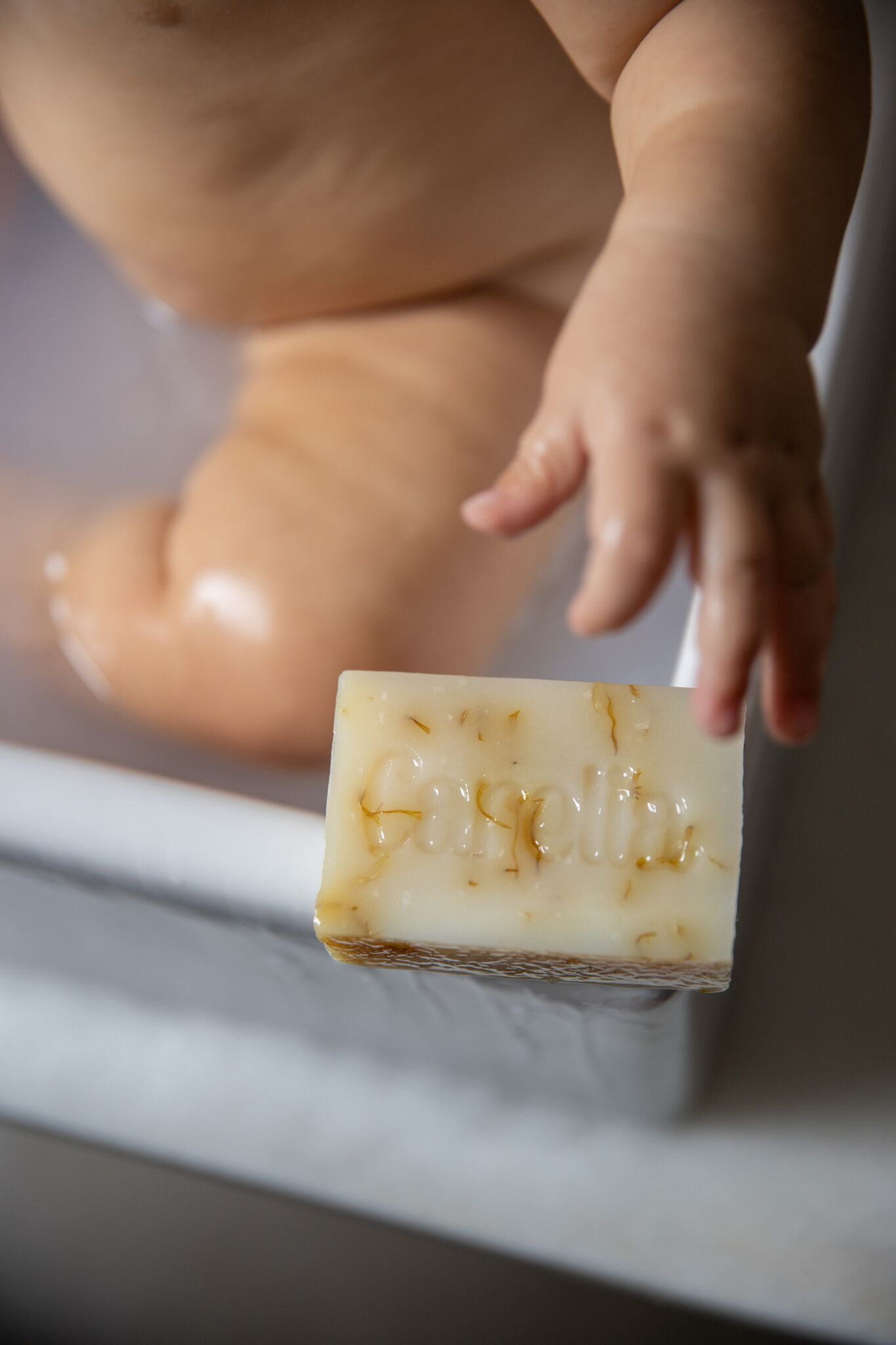 Jabón calmante y protector elaborado de forma tradicional a partir de una base de aceites vegetales prensados en frío 100% puros (aceite de oliva + aceite de coco) Enriquecido con caléndula orgánica por sus propiedades calmantes y suavizantes, ha sido formulado especialmente para la piel más sensible y delicada.